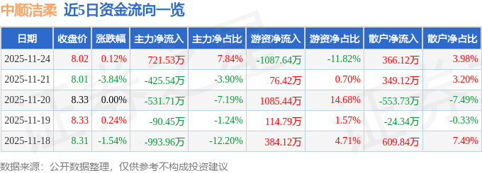 证券之星消息,截至2025年11月24日收盘,中顺洁柔(002511)报收于8.02元,上涨0.12%,换手率0.9%,成交量11.43万手,成交额9201.04万元。