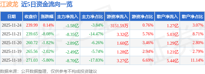 证券之星消息,截至2025年11月24日收盘,江波龙(301308)报收于239.99元,上涨0.14%,换手率6.35%,成交量17.43万手,成交额41.25亿元。
