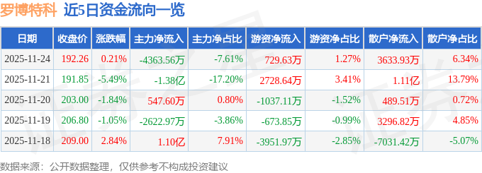 证券之星消息,截至2025年11月24日收盘,罗博特科(300757)报收于192.26元,上涨0.21%,换手率2.01%,成交量2.98万手,成交额5.73亿元。
