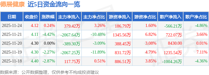 证券之星消息,截至2025年11月24日收盘,德展健康(000813)报收于4.12元,上涨0.24%,换手率1.35%,成交量28.21万手,成交额1.16亿元。