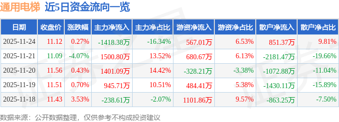 证券之星消息,截至2025年11月24日收盘,通用电梯(300931)报收于11.12元,上涨0.27%,换手率4.23%,成交量7.82万手,成交额8679.69万元。