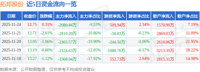 证券之星消息,截至2025年11月24日收盘,拓邦股份(002139)报收于12.75元,上涨0.31%,换手率1.61%,成交量17.21万手,成交额2.18亿元。