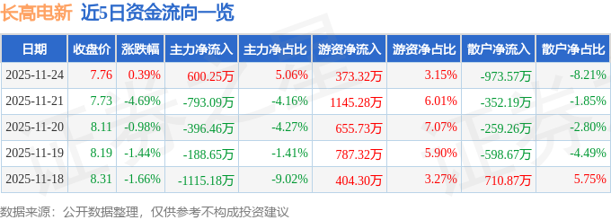 证券之星消息,截至2025年11月24日收盘,长高电新(002452)报收于7.76元,上涨0.39%,换手率2.97%,成交量15.32万手,成交额1.19亿元。