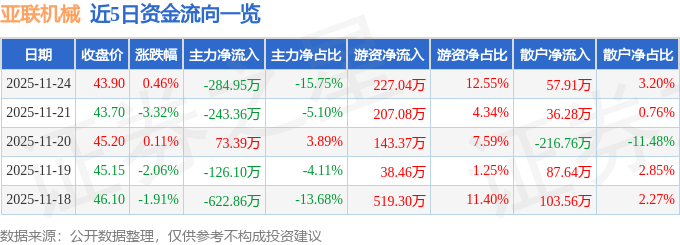 证券之星消息,截至2025年11月24日收盘,亚联机械(001395)报收于43.9元,上涨0.46%,换手率2.1%,成交量4126.0手,成交额1809.53万元。