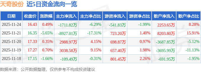 证券之星消息,截至2025年11月24日收盘,天奇股份(002009)报收于16.43元,上涨0.49%,换手率4.74%,成交量16.8万手,成交额2.72亿元。