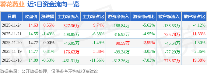 证券之星消息,截至2025年11月24日收盘,葵花药业(002737)报收于14.63元,上涨0.55%,换手率0.39%,成交量2.3万手,成交额3360.04万元。