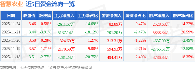 证券之星消息,截至2025年11月24日收盘,智慧农业(000816)报收于3.46元,上涨0.58%,换手率3.57%,成交量51.29万手,成交额1.78亿元。