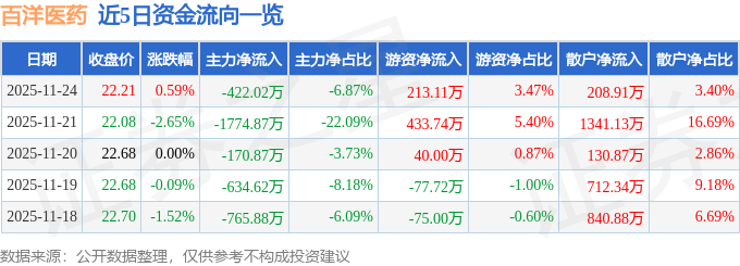 证券之星消息,截至2025年11月24日收盘,百洋医药(301015)报收于22.21元,上涨0.59%,换手率0.53%,成交量2.77万手,成交额6141.46万元。