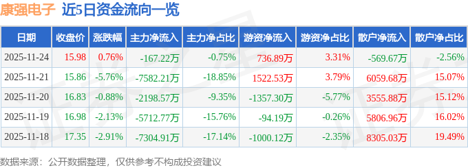 证券之星消息,截至2025年11月24日收盘,康强电子(002119)报收于15.98元,上涨0.76%,换手率3.73%,成交量14.0万手,成交额2.22亿元。