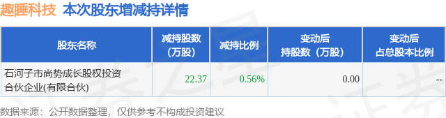 证券之星消息,11月24日趣睡科技发布公告《趣睡科技:成都趣睡科技股份有限公司关于特定股东股份减持结果的公告》,其股东石河子市尚势成长股权投资合伙企业(有限合伙)于2025年9月19日至2025年11月24日间合计减持22.37万股,占公司目前总股本的0.5593%,变动期间该股股价下跌4.78%,截止11月24日收盘报51.21元。