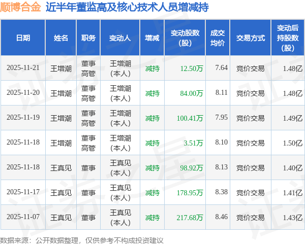 顺博合金近半年内的董监高及核心技术人员增减持详情如下: