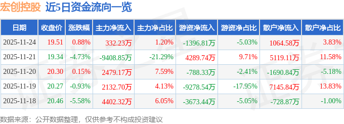 证券之星消息,截至2025年11月24日收盘,宏创控股(002379)报收于19.51元,上涨0.88%,换手率1.25%,成交量14.25万手,成交额2.78亿元。