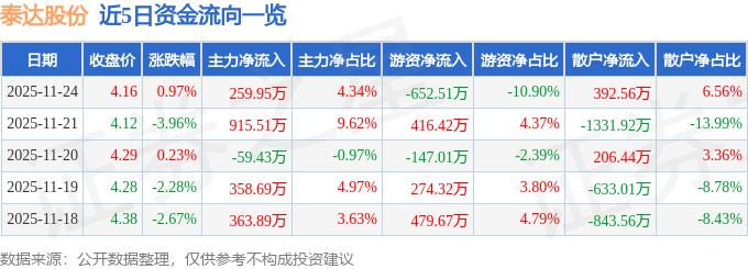 证券之星消息,截至2025年11月24日收盘,泰达股份(000652)报收于4.16元,上涨0.97%,换手率0.98%,成交量14.38万手,成交额5987.3万元。
