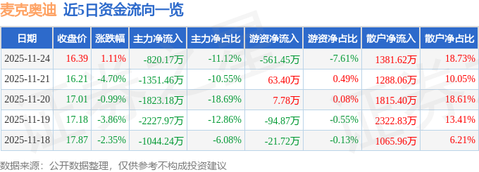 证券之星消息,截至2025年11月24日收盘,麦克奥迪(300341)报收于16.39元,上涨1.11%,换手率0.88%,成交量4.51万手,成交额7376.24万元。