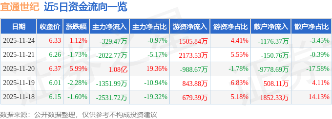 证券之星消息,截至2025年11月24日收盘,宜通世纪(300310)报收于6.33元,上涨1.12%,换手率7.85%,成交量54.33万手,成交额3.41亿元。