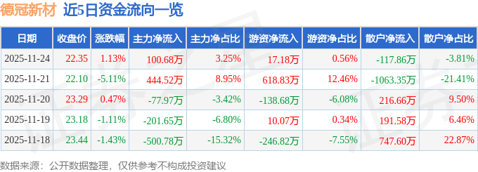证券之星消息,截至2025年11月24日收盘,德冠新材(001378)报收于22.35元,上涨1.13%,换手率2.11%,成交量1.39万手,成交额3094.03万元。