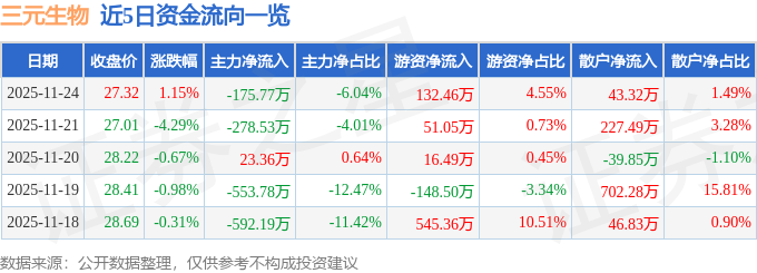 证券之星消息,截至2025年11月24日收盘,三元生物(301206)报收于27.32元,上涨1.15%,换手率0.82%,成交量1.06万手,成交额2908.85万元。