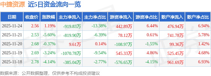 证券之星消息,截至2025年11月24日收盘,中捷资源(002021)报收于2.56元,上涨1.19%,换手率2.26%,成交量27.02万手,成交额6877.16万元。