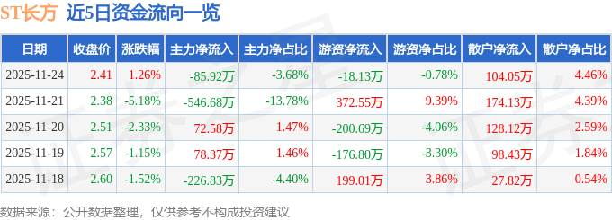 证券之星消息,截至2025年11月24日收盘,ST长方(300301)报收于2.41元,上涨1.26%,换手率1.24%,成交量9.76万手,成交额2332.66万元。