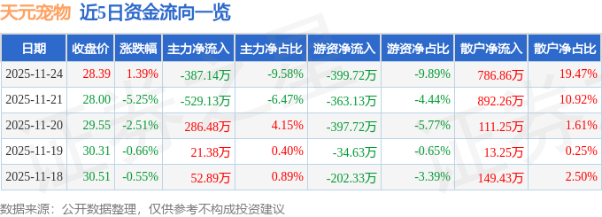 证券之星消息,截至2025年11月24日收盘,天元宠物(301335)报收于28.39元,上涨1.39%,换手率2.82%,成交量1.43万手,成交额4041.48万元。