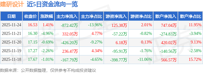 证券之星消息,截至2025年11月24日收盘,建研设计(301167)报收于16.53元,上涨1.41%,换手率5.32%,成交量3.78万手,成交额6251.42万元。