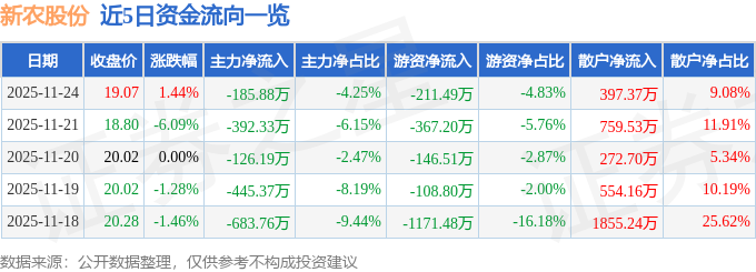 证券之星消息,截至2025年11月24日收盘,新农股份(002942)报收于19.07元,上涨1.44%,换手率1.68%,成交量2.3万手,成交额4377.47万元。