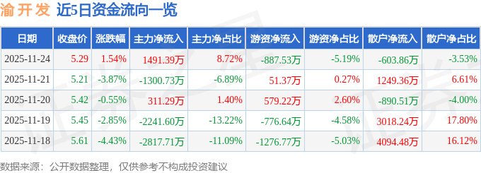证券之星消息,截至2025年11月24日收盘,渝 开 发(000514)报收于5.29元,上涨1.54%,换手率3.83%,成交量32.3万手,成交额1.71亿元。