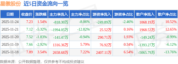 证券之星消息,截至2025年11月24日收盘,星徽股份(300464)报收于7.23元,上涨1.54%,换手率4.0%,成交量14.23万手,成交额1.02亿元。