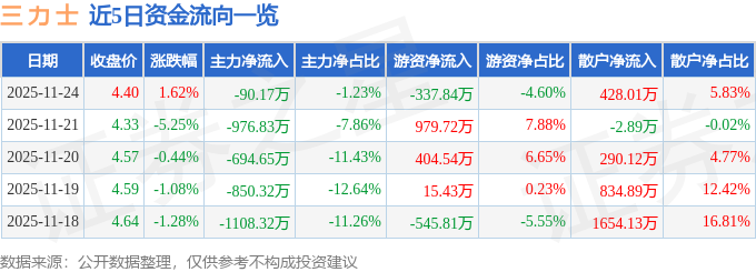 证券之星消息,截至2025年11月24日收盘,三 力 士(002224)报收于4.4元,上涨1.62%,换手率2.08%,成交量16.74万手,成交额7338.26万元。