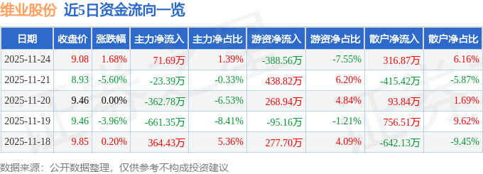 证券之星消息,截至2025年11月24日收盘,维业股份(300621)报收于9.08元,上涨1.68%,换手率2.79%,成交量5.65万手,成交额5143.54万元。