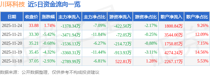 证券之星消息,截至2025年11月24日收盘,川环科技(300547)报收于33.88元,上涨1.74%,换手率3.25%,成交量5.79万手,成交额1.95亿元。