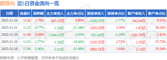 证券之星消息,截至2025年11月24日收盘,欧菲光(002456)报收于11.42元,上涨1.78%,换手率1.88%,成交量62.48万手,成交额7.06亿元。
