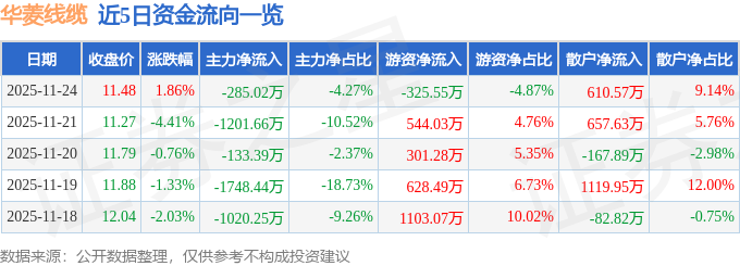 证券之星消息,截至2025年11月24日收盘,华菱线缆(001208)报收于11.48元,上涨1.86%,换手率2.22%,成交量5.86万手,成交额6681.1万元。