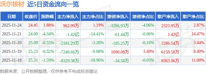 证券之星消息,截至2025年11月24日收盘,沃尔核材(002130)报收于24.45元,上涨1.88%,换手率2.92%,成交量33.46万手,成交额8.1亿元。
