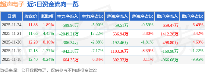 证券之星消息,截至2025年11月24日收盘,超声电子(000823)报收于11.88元,上涨1.89%,换手率1.6%,成交量8.58万手,成交额1.02亿元。