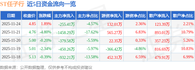 证券之星消息,截至2025年11月24日收盘,ST任子行(300311)报收于4.85元,上涨1.89%,换手率2.16%,成交量11.63万手,成交额5594.06万元。
