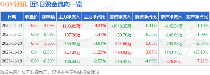 证券之星消息,截至2025年11月24日收盘,GQY视讯(300076)报收于6.83元,上涨2.09%,换手率4.5%,成交量19.08万手,成交额1.29亿元。