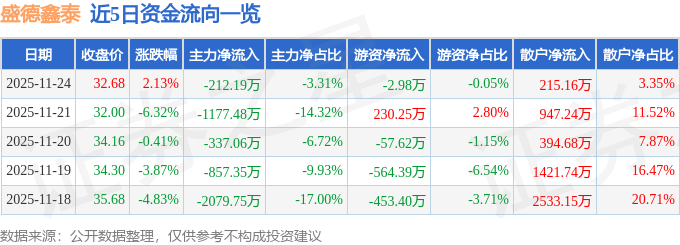 证券之星消息,截至2025年11月24日收盘,盛德鑫泰(300881)报收于32.68元,上涨2.13%,换手率3.43%,成交量1.97万手,成交额6417.39万元。