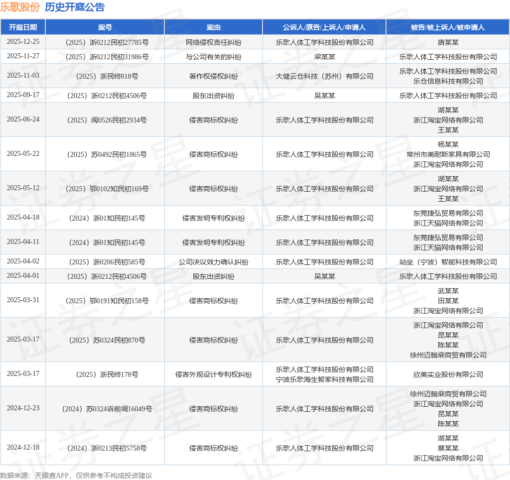 案号:(2025)浙0212民初31986号根据统计,近一年内以乐歌人体工学科技股份有限公司为当事人的历史开庭公告有16则,其中案由为“侵害商标权纠纷”的公告以7则居首,其次为“侵害发明专利权纠纷”有2则,“股东出资纠纷”有2则。历史开庭公告如下: