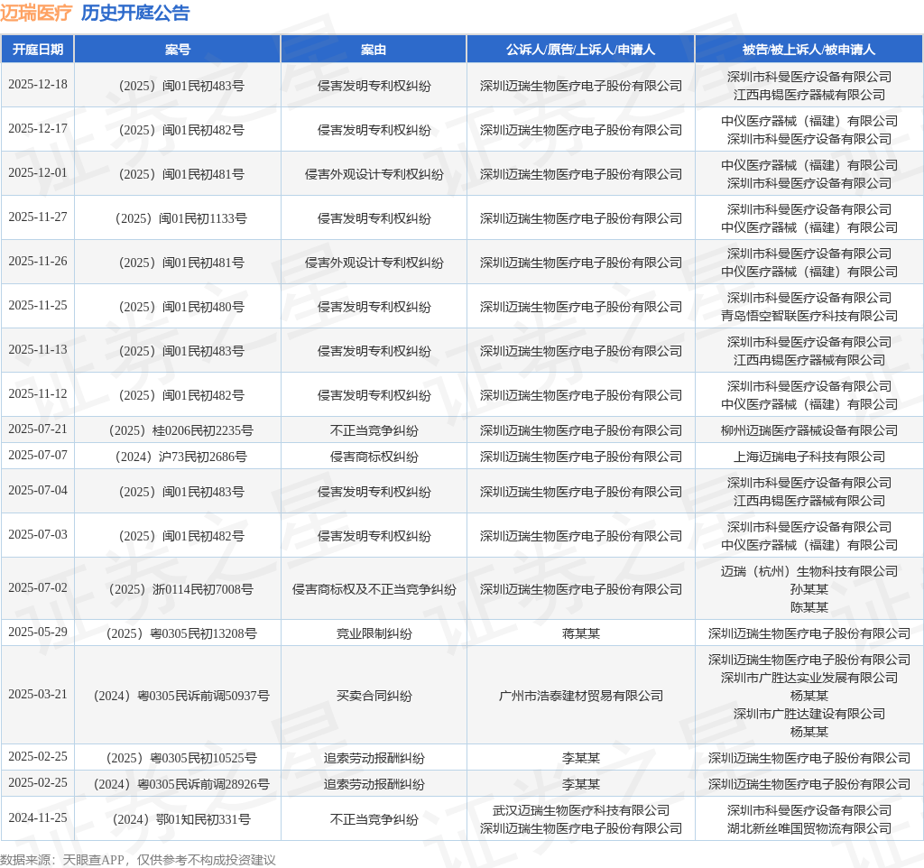 案号:(2025)闽01民初1133号根据统计,近一年内以深圳迈瑞生物医疗电子股份有限公司为当事人的历史开庭公告有18则,其中案由为“侵害发明专利权纠纷”的公告以8则居首,其次为“不正当竞争纠纷”有2则,“侵害外观设计专利权纠纷”有2则。历史开庭公告如下: