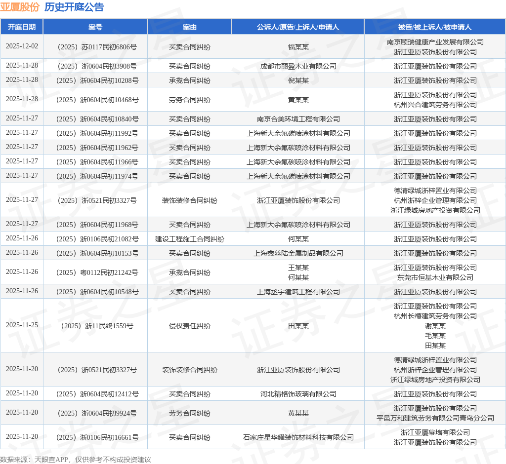 案号:(2025)浙0521民初3327号根据统计,近一年内以浙江亚厦装饰股份有限公司为当事人的历史开庭公告有583则,其中案由为“买卖合同纠纷”的公告以207则居首,其次为“劳务合同纠纷”有109则,“建设工程施工合同纠纷”有63则。历史开庭公告(前20条)如下: