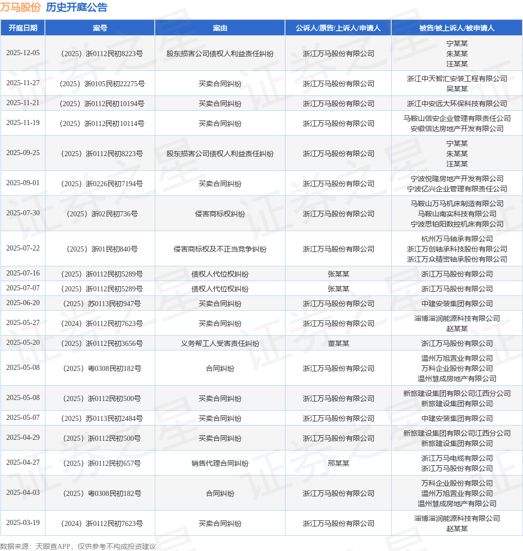 案号:(2025)浙0105民初22275号根据统计,近一年内以浙江万马股份有限公司为当事人的历史开庭公告有28则,其中案由为“买卖合同纠纷”的公告以13则居首,其次为“合同纠纷”有6则,“债权人代位权纠纷”有2则。历史开庭公告(前20条)如下: