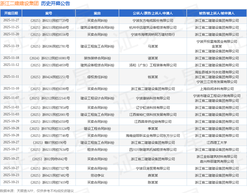 案号:(2025)浙0211民初7729号根据统计,近一年内以浙江省二建建设集团有限公司为当事人的历史开庭公告有131则,其中案由为“买卖合同纠纷”的公告以37则居首,其次为“建设工程施工合同纠纷”有31则,“建设工程合同纠纷”有12则。历史开庭公告(前20条)如下: