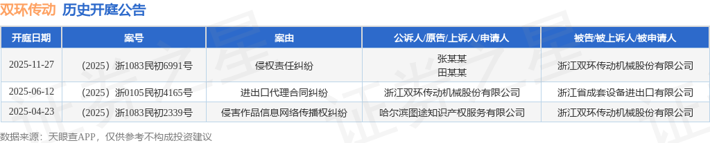 案号:(2025)浙1083民初6991号根据统计,近一年内以浙江双环传动机械股份有限公司为当事人的历史开庭公告有3则,其中案由为“侵害作品信息网络传播权纠纷”的公告以1则居首,其次为“侵权责任纠纷”有1则,“进出口代理合同纠纷”有1则。历史开庭公告如下: