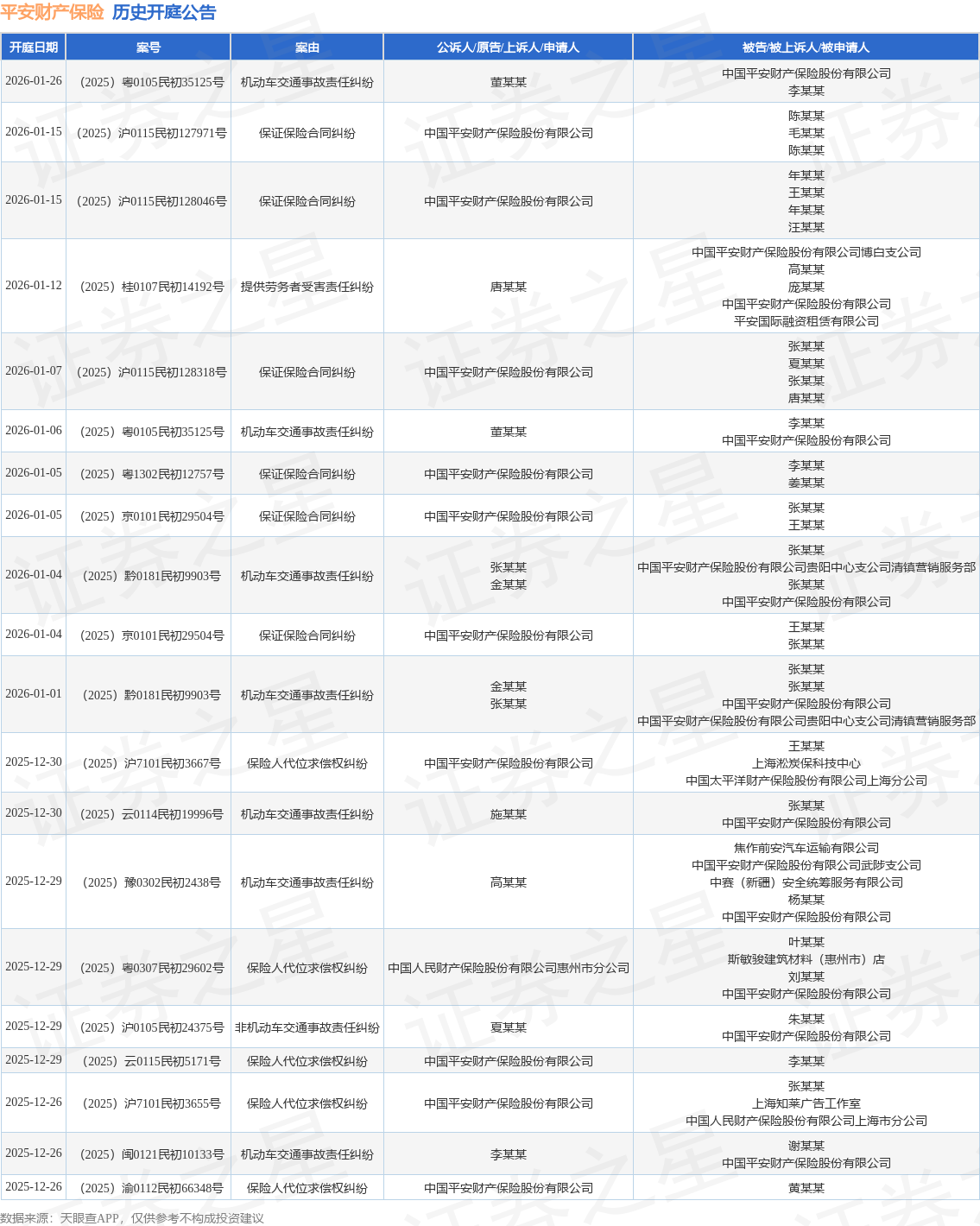 案号:(2025)浙0282民初20556号根据统计,近一年内以中国平安财产保险股份有限公司为当事人的历史开庭公告有2245则,其中案由为“机动车交通事故责任纠纷”的公告以1087则居首,其次为“保证保险合同纠纷”有274则,“保险人代位求偿权纠纷”有182则。历史开庭公告(前20条)如下: