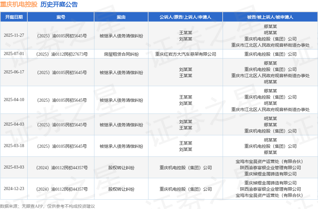 案号:(2025)渝0105民初5645号根据统计,近一年内以重庆机电控股(集团)公司为当事人的历史开庭公告有8则,其中案由为“被继承人债务清偿纠纷”的公告以5则居首,其次为“股权转让纠纷”有2则,“房屋租赁合同纠纷”有1则。历史开庭公告如下: