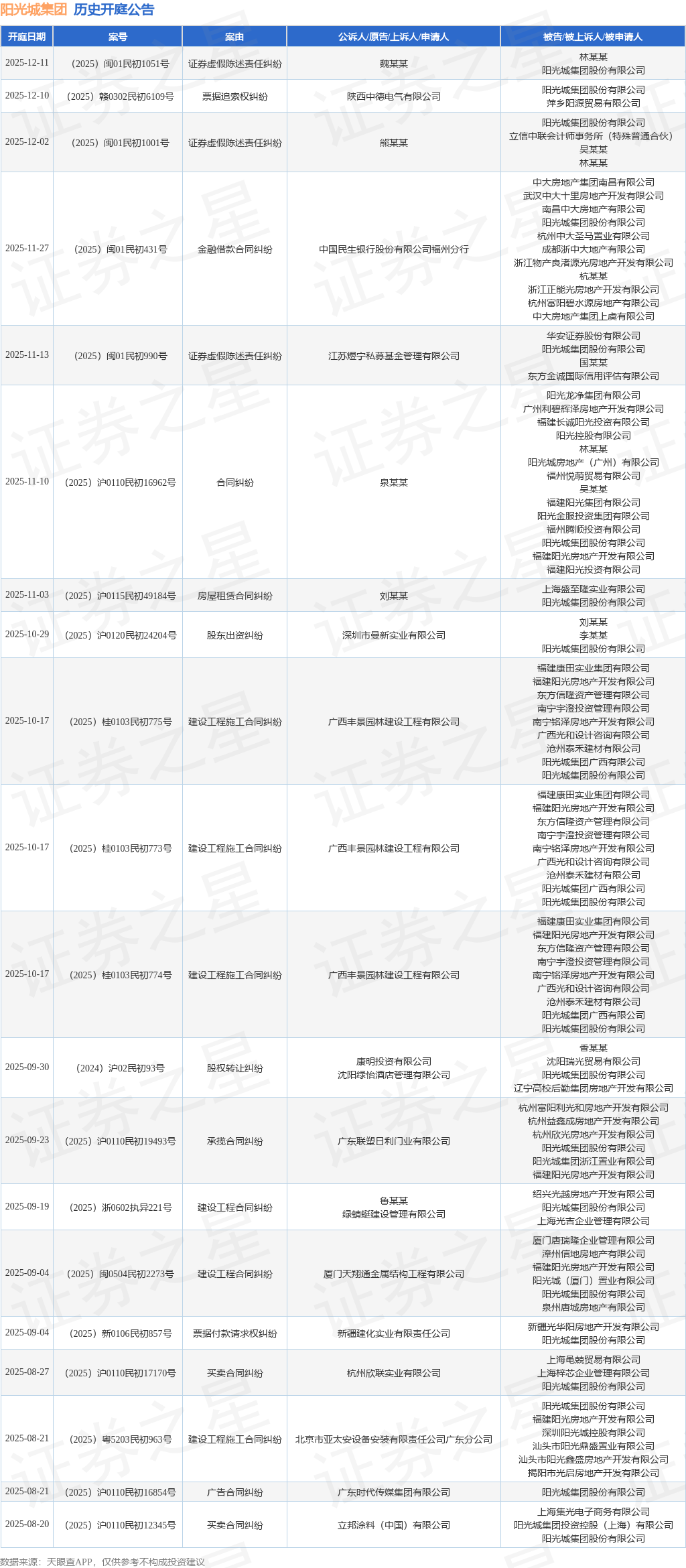 案号:(2025)闽01民初431号根据统计,近一年内以阳光城集团股份有限公司为当事人的历史开庭公告有108则,其中案由为“买卖合同纠纷”的公告以31则居首,其次为“票据追索权纠纷”有20则,“合同纠纷”有7则。历史开庭公告(前20条)如下: