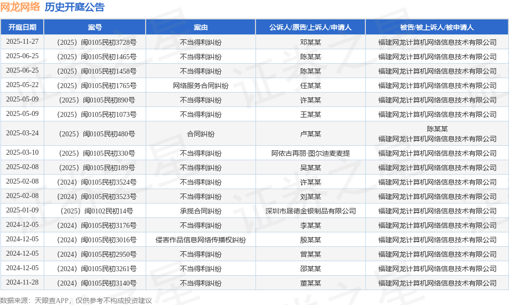 案号:(2025)闽0105民初3728号根据统计,近一年内以福建网龙计算机网络信息技术有限公司为当事人的历史开庭公告有17则,其中案由为“不当得利纠纷”的公告以13则居首,其次为“侵害作品信息网络传播权纠纷”有1则,“合同纠纷”有1则。历史开庭公告如下: