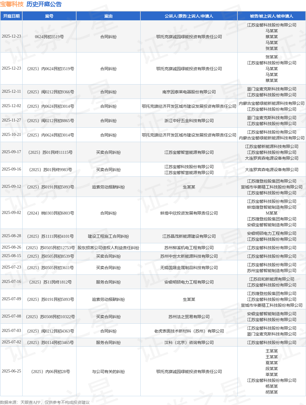 案号:(2025)闽0212民初8865号根据统计,近一年内以江苏宝馨科技股份有限公司为当事人的历史开庭公告有73则,其中案由为“买卖合同纠纷”的公告以25则居首,其次为“合同纠纷”有13则,“服务合同纠纷”有7则。历史开庭公告(前20条)如下: