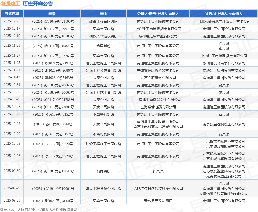 案号:(2025)沪0117民初27763号根据统计,近一年内以南通建工集团股份有限公司为当事人的历史开庭公告有319则,其中案由为“买卖合同纠纷”的公告以93则居首,其次为“建设工程施工合同纠纷”有57则,“建设工程分包合同纠纷”有39则。历史开庭公告(前20条)如下: